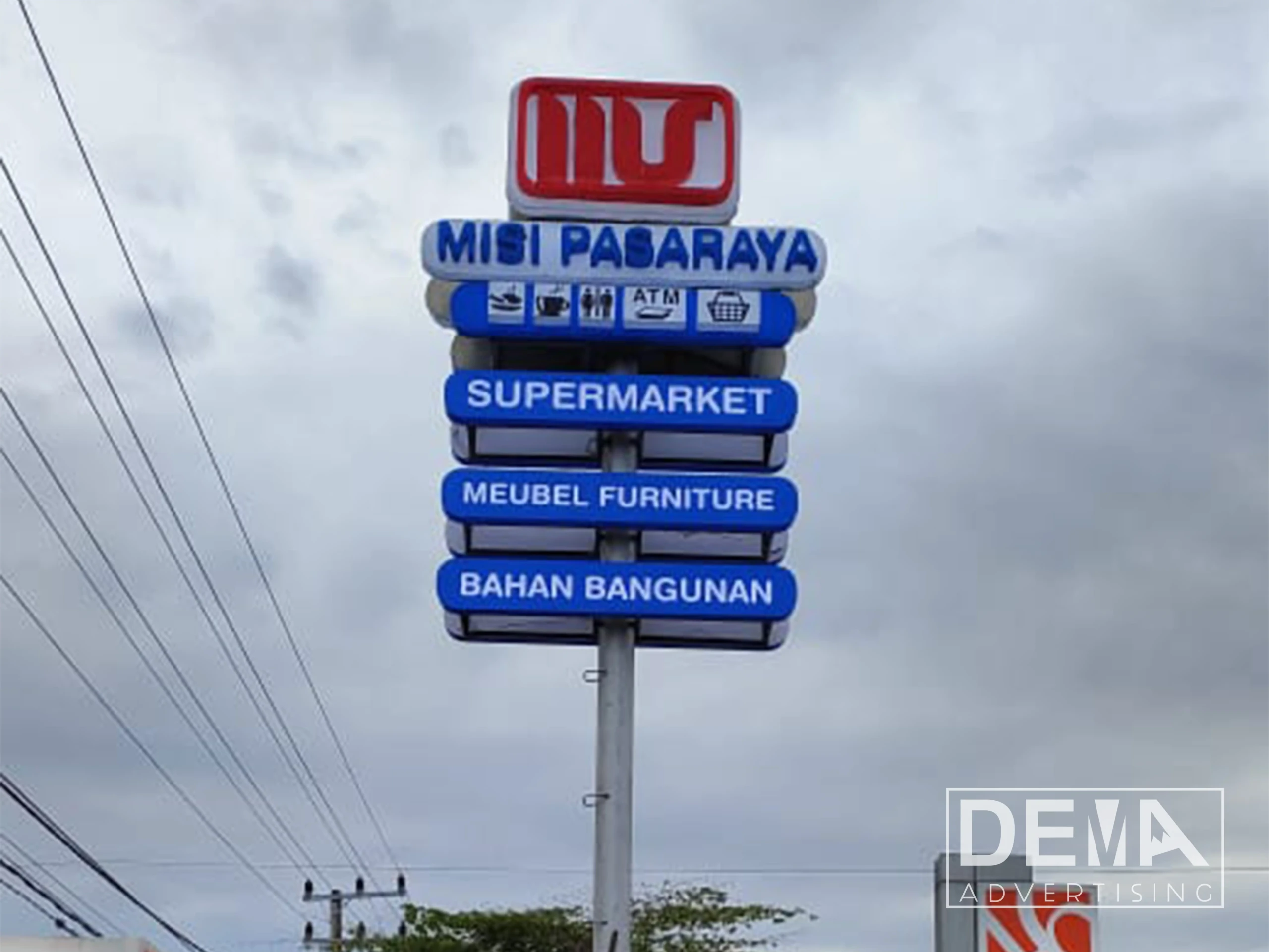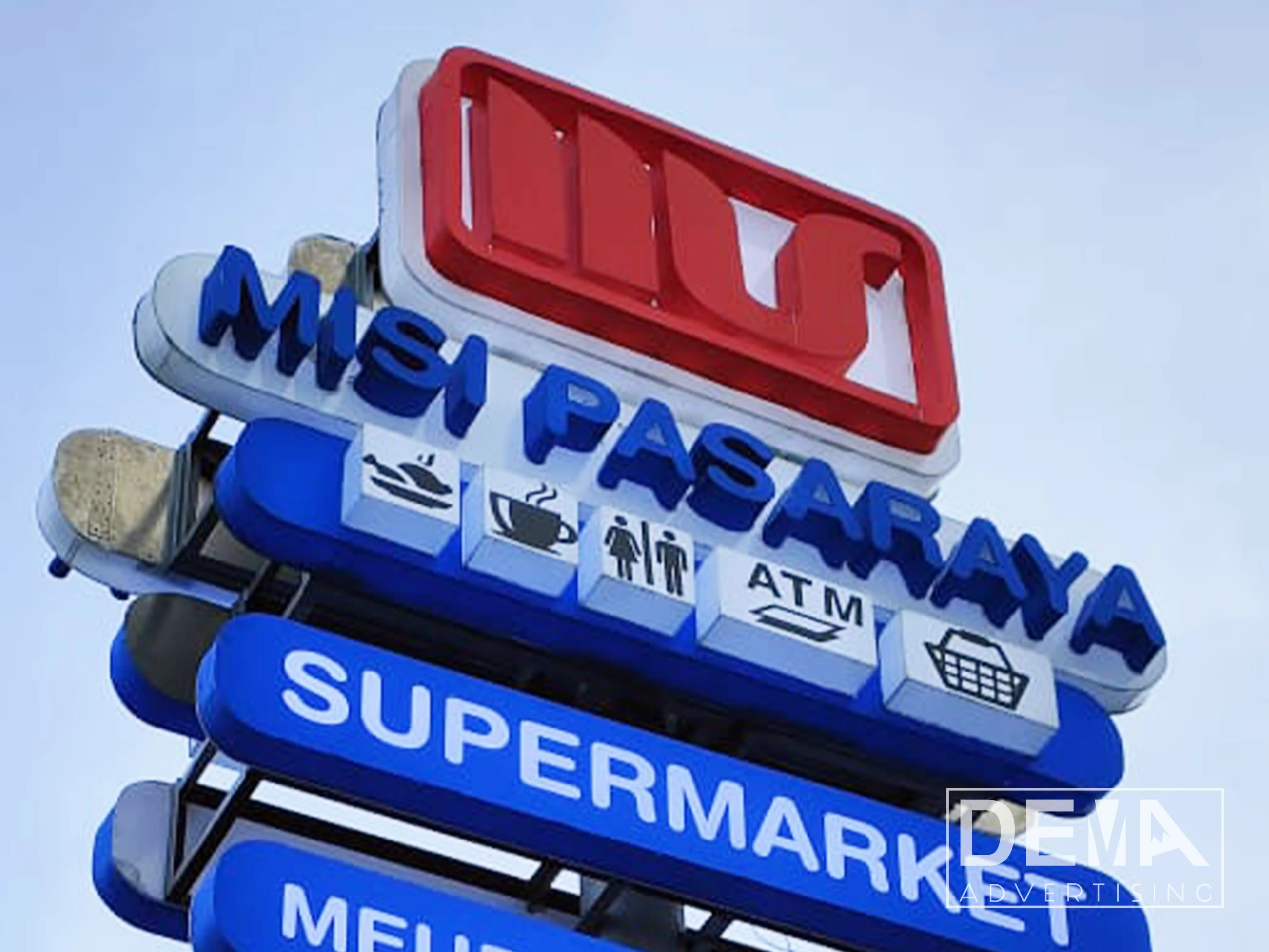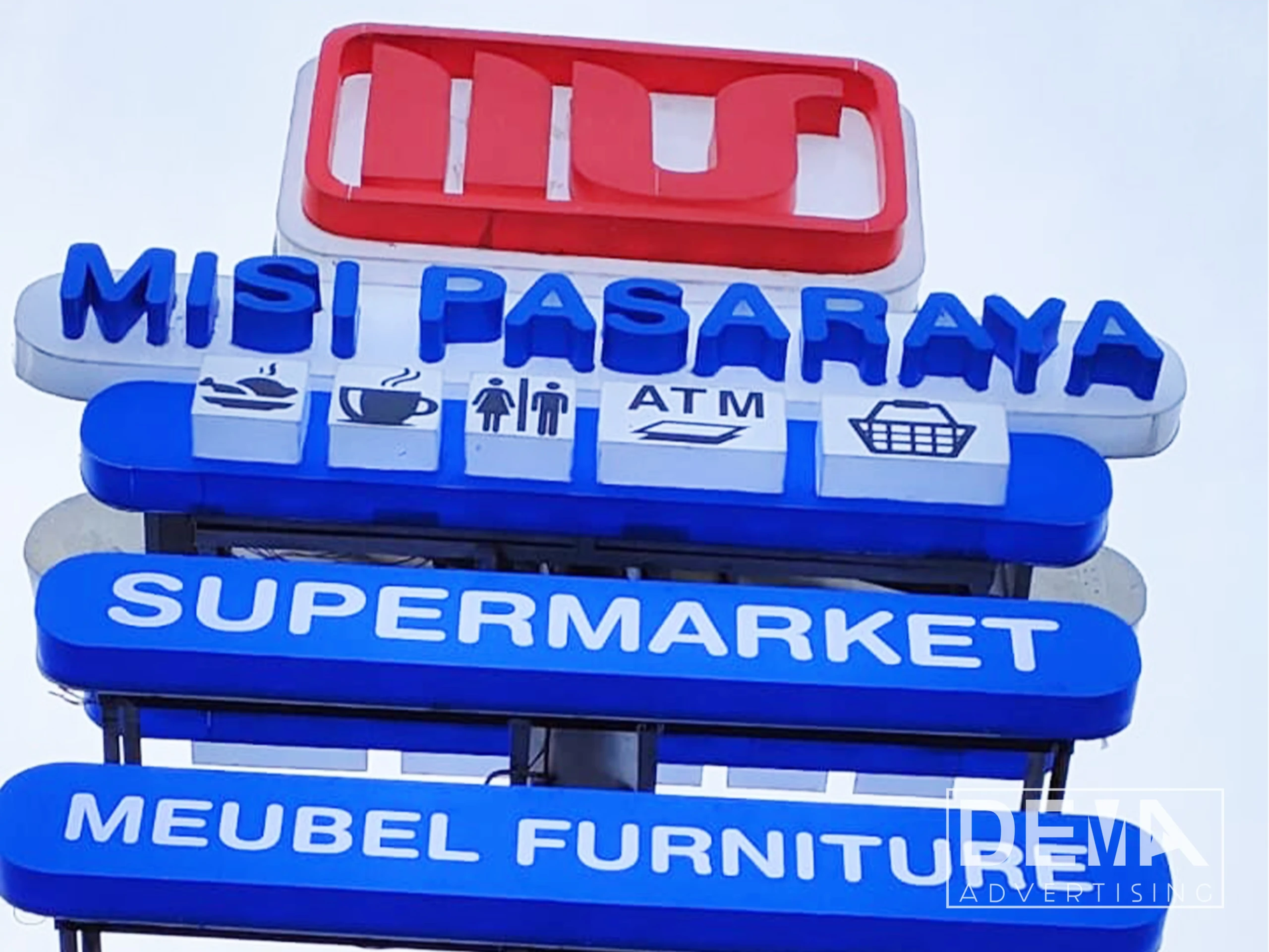 Neon Box Misi Pasaraya dirancang dengan desain tegas dan sederhana namun tetap elegan. Penggunaan lampu LED memudahkan pelanggan mengenali lokasi toko dengan jelas. Dema Advertising menggunakan material berkualitas tinggi dan dikerjakan oleh tim profesional. Dema Advertising – solusi tepat untuk kebutuhan promosi visual Anda.