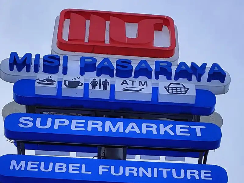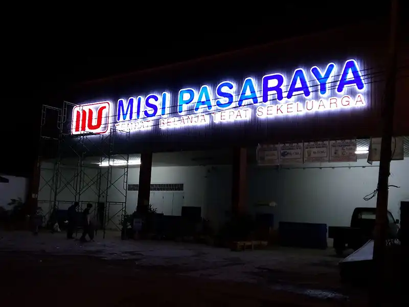 Huruf timbul acrylic LED Misi Pasaraya dibuat dengan desain tegas dan sederhana namun tetap elegan. Penggunaan lampu LED memastikan visibilitas optimal, memudahkan pelanggan mengenali lokasi toko dengan tepat. **Dema Advertising** memilih material berkualitas tinggi dan dikerjakan oleh tim profesional untuk menghasilkan produk terbaik. **Dema Advertising** adalah solusi tepat untuk kebutuhan media promosi Anda.